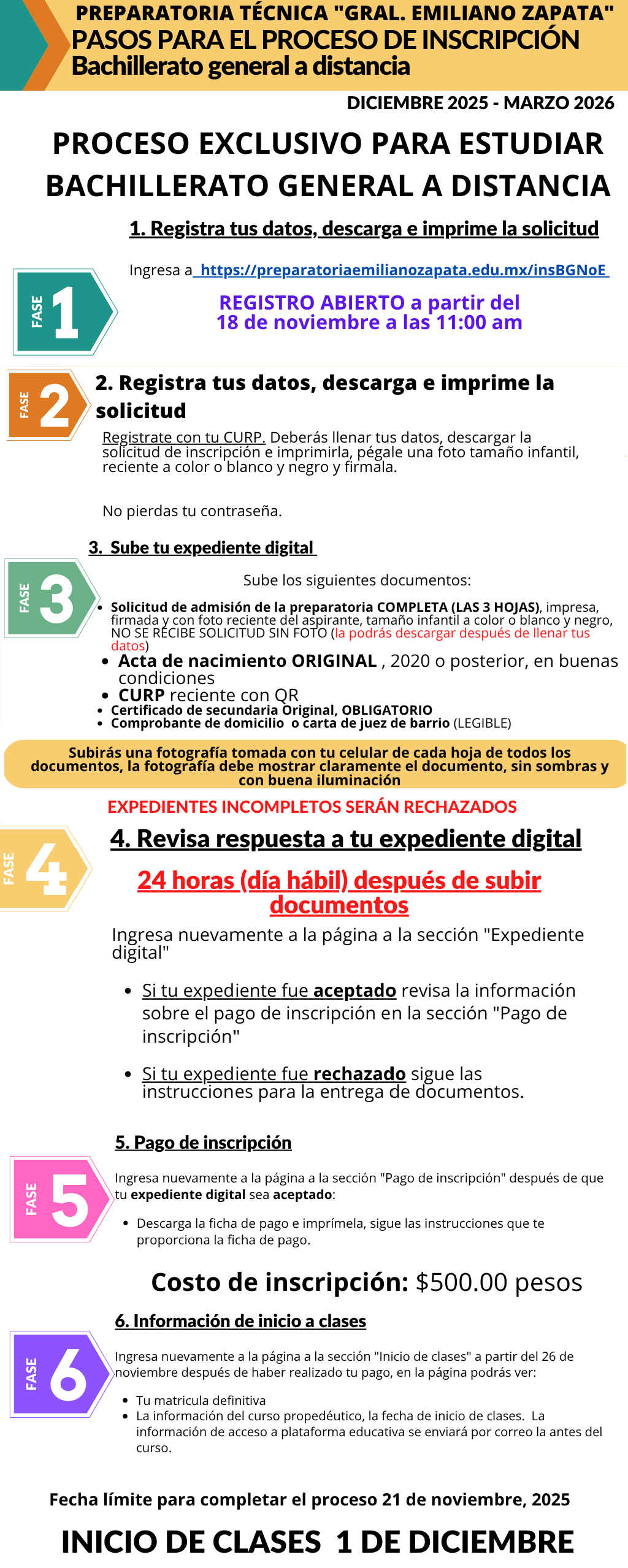 Es OBLIGATORIO tener tu secundaria TERMINADA y contar con el CERTIFICADO DE SECUNDARIA para poder inscribirte a esta convocatoria. SI AÚN NO TERMINAS LA SECUNDARIA debes ponerte en contacto al correo admin@preparatoriaemilianozapata.edu.mx